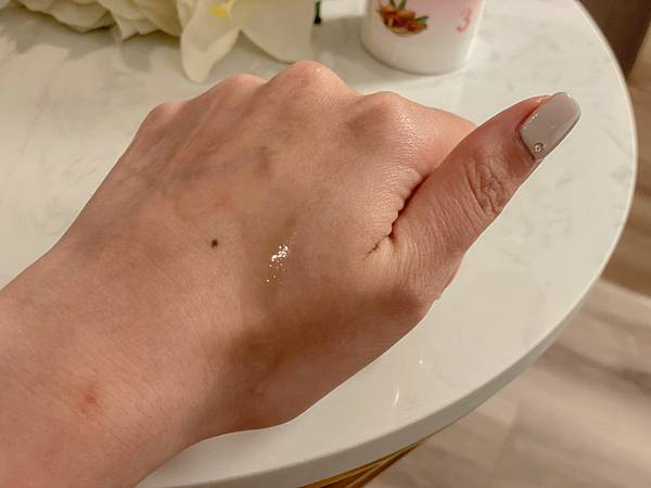 拿出剛剛除毛前使用的維他命E呵護調理油(粉瓶) ,輕輕地在肌膚上繞圈擦拭,不僅能夠清除殘蠟,還可以幫助肌膚滋潤與保護