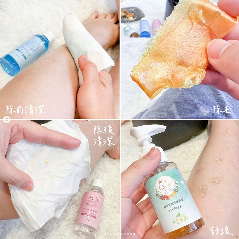 除毛前清潔液:確保肌膚乾淨,提升除毛效果。 除毛後清潔油:快速去除殘留蠟,皮膚清爽不黏膩。 蘆薈舒緩凝膠:有效緩解紅腫癢感,曬後也可使用。 一包蠟可以處理多個部位,只要覺得哪裡需要除毛,就可以輕鬆應對。不論是大腿、小腿、膝蓋還是腋下,甚至比基尼線,都能輕鬆搞定!除毛過程既方便又快速,完成後還充滿成就感。\