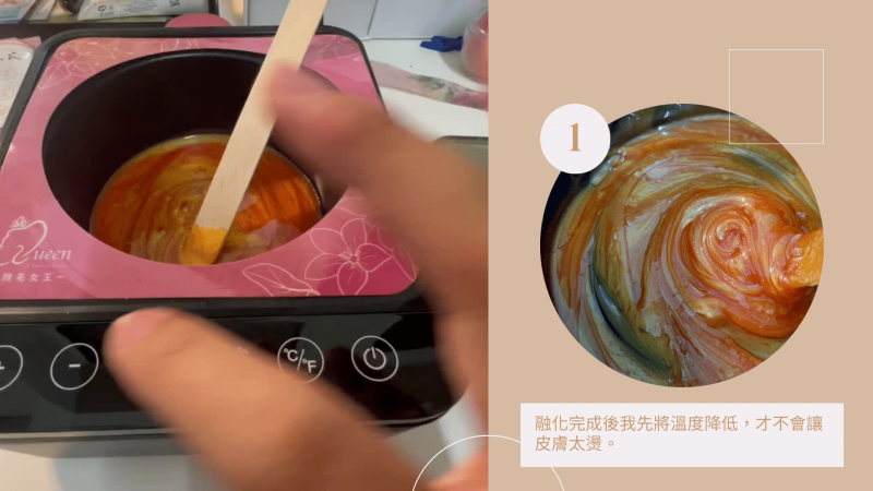 融化完全後,我是先在手臂上測試溫度,因為覺得有點燙,所以後來我有先把溫度降低為65度,再等了1分鐘後,我就開始先從小腿的毛做嘗試。
