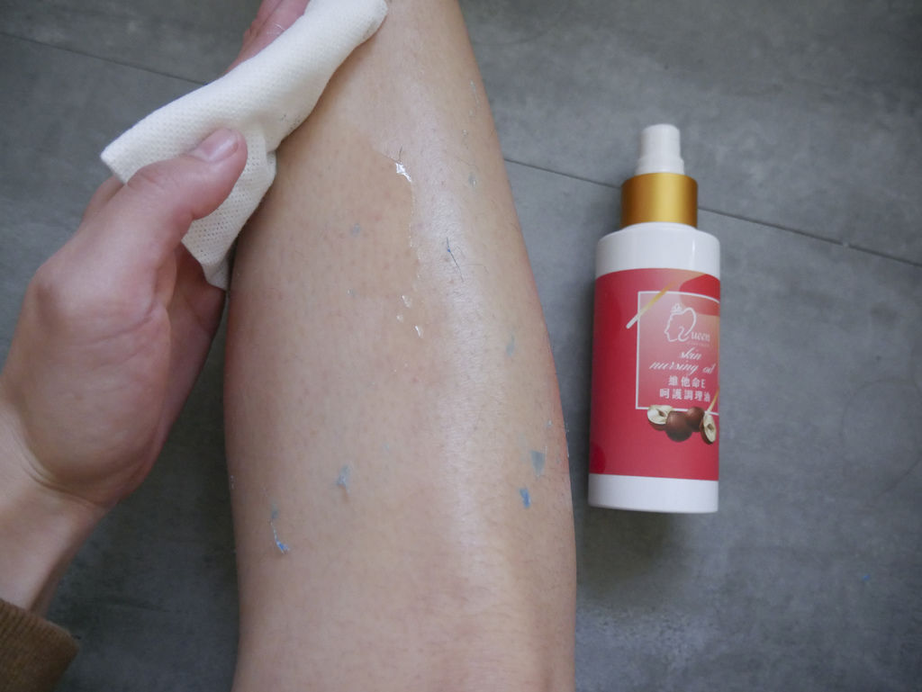 維他命E肌膚調理油上在皮膚會像是保護膜一樣有一層東西保護你,熱蠟撕下來也不會覺得過於乾燥
