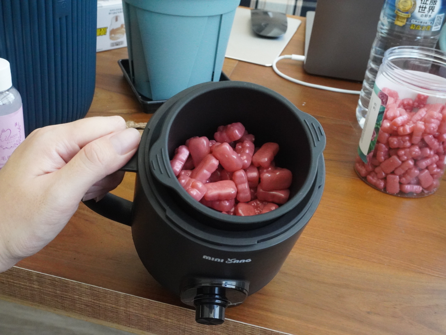 溫度調整至75度,插電後聽見逼逼聲後,再按開關鍵,蠟豆加熱至完全融化呈現稍微濃稠的可流動狀態。加熱時間約30分鐘(不需要過度攪拌以免攪入過多氣泡)