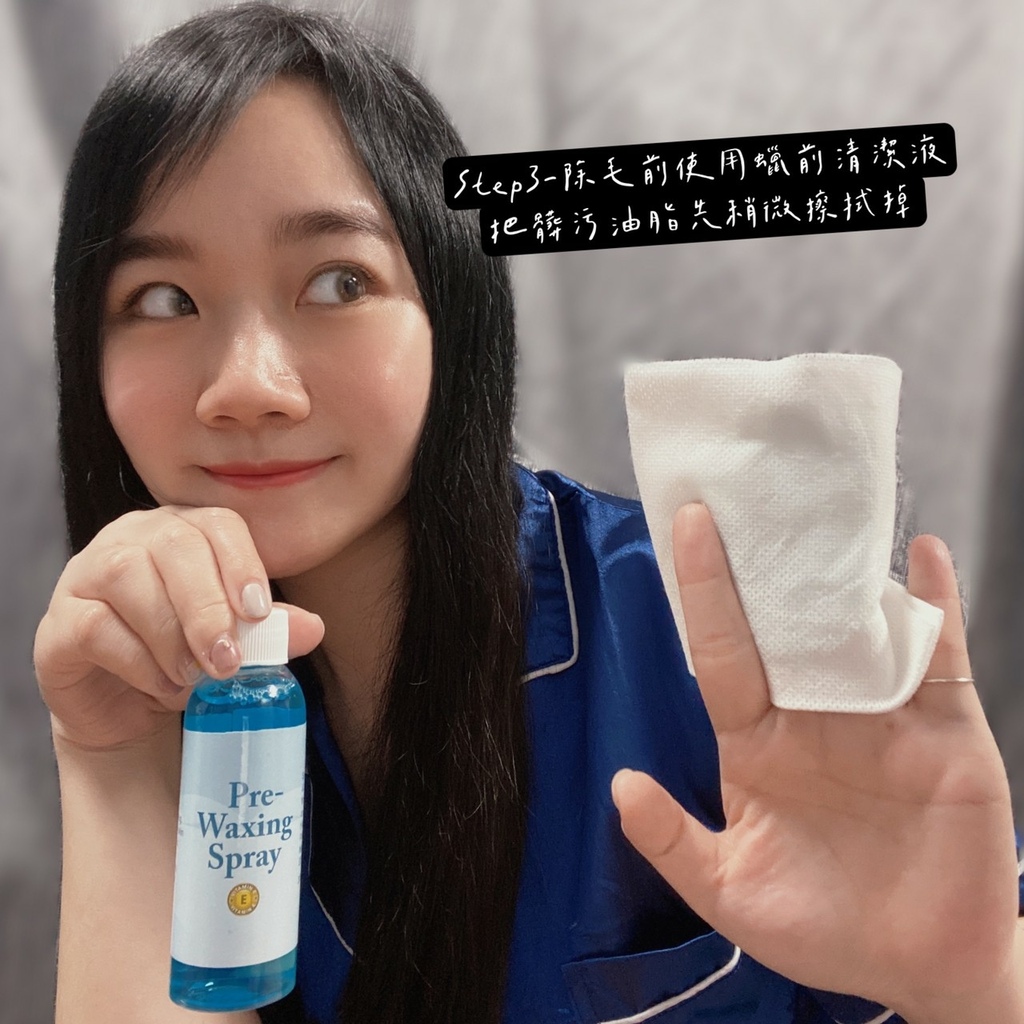 我會搭配隨附的擦拭紙巾,倒適量的蠟前清潔液,把要除毛的部位有些髒污或油漬擦拭乾淨。