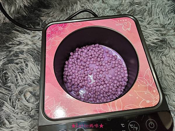 倒入適量的蠟豆!Latte選擇的蠟豆是寶石星空蠟豆--幽靜紫。星空蠟豆含有保濕配方,