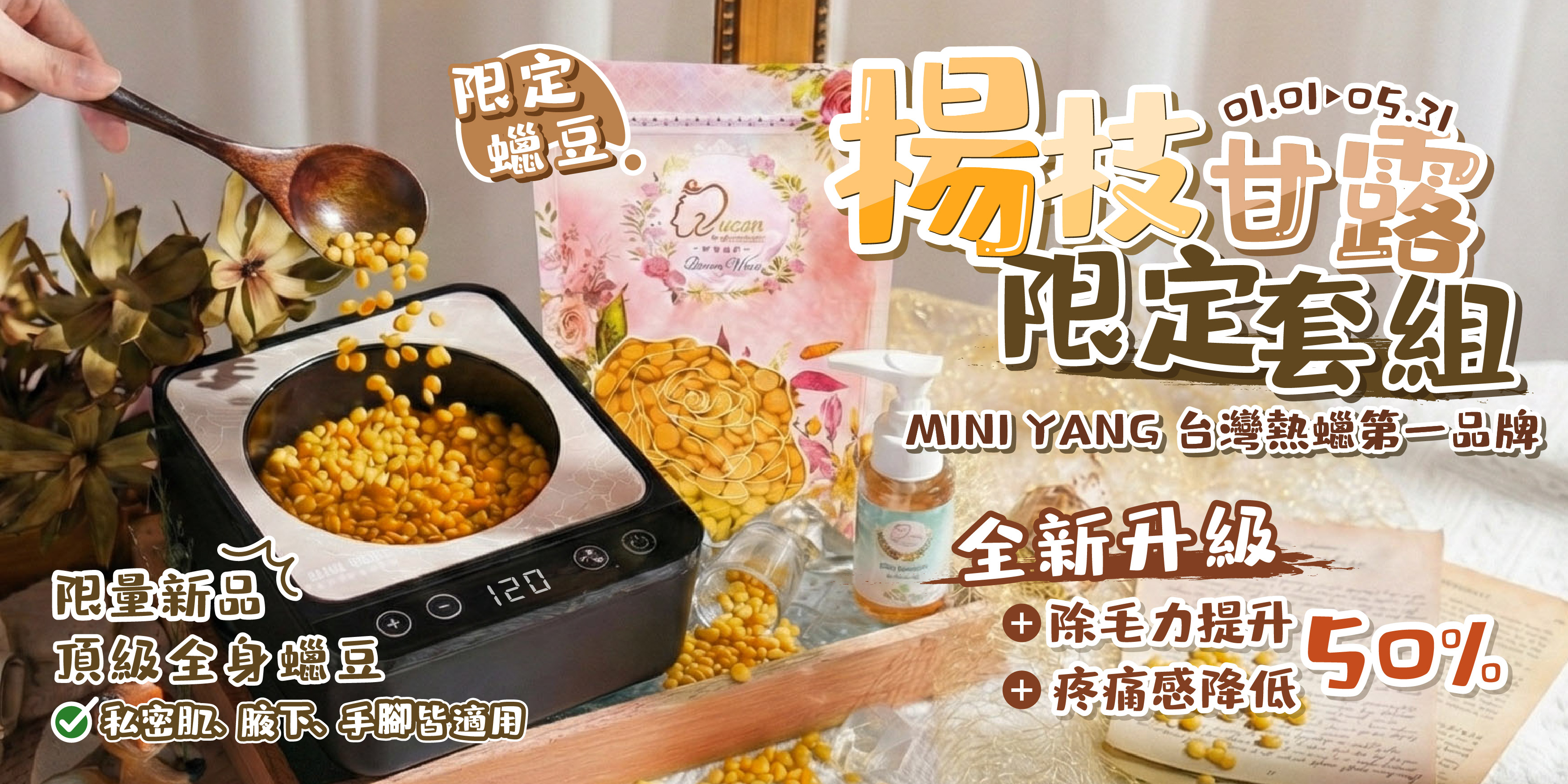 | 【MINI YANG 楊枝甘露限定套組】 活動期間:2026/01/01~2026/05/31 活動資訊: 楊枝甘露蠟豆200克,期間限定蠟豆 【楊枝甘露限定除毛套組】 一般清潔套組 限時優惠$2099 【楊枝甘露限定除毛套組】 頂級保養套組 限時優惠$3699 |