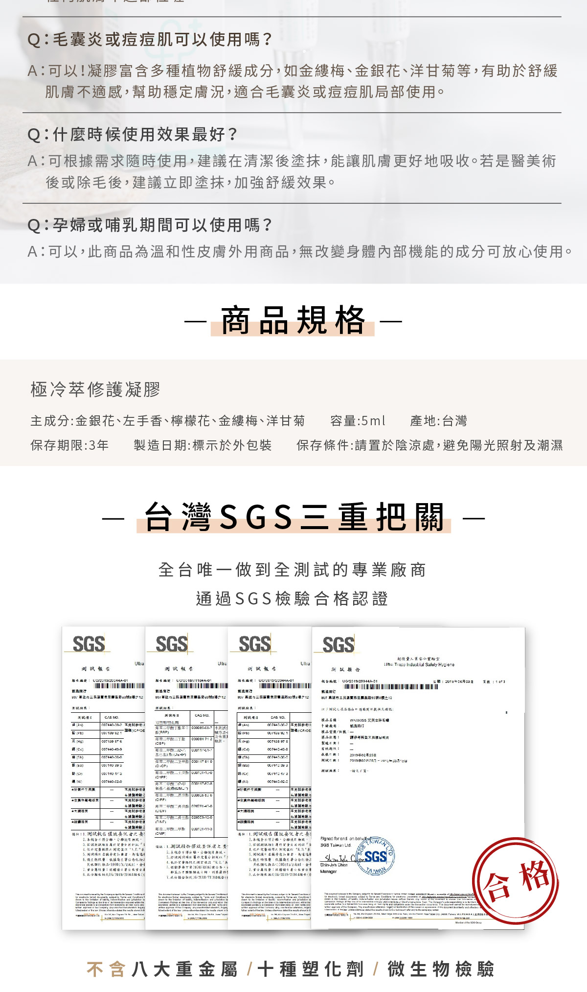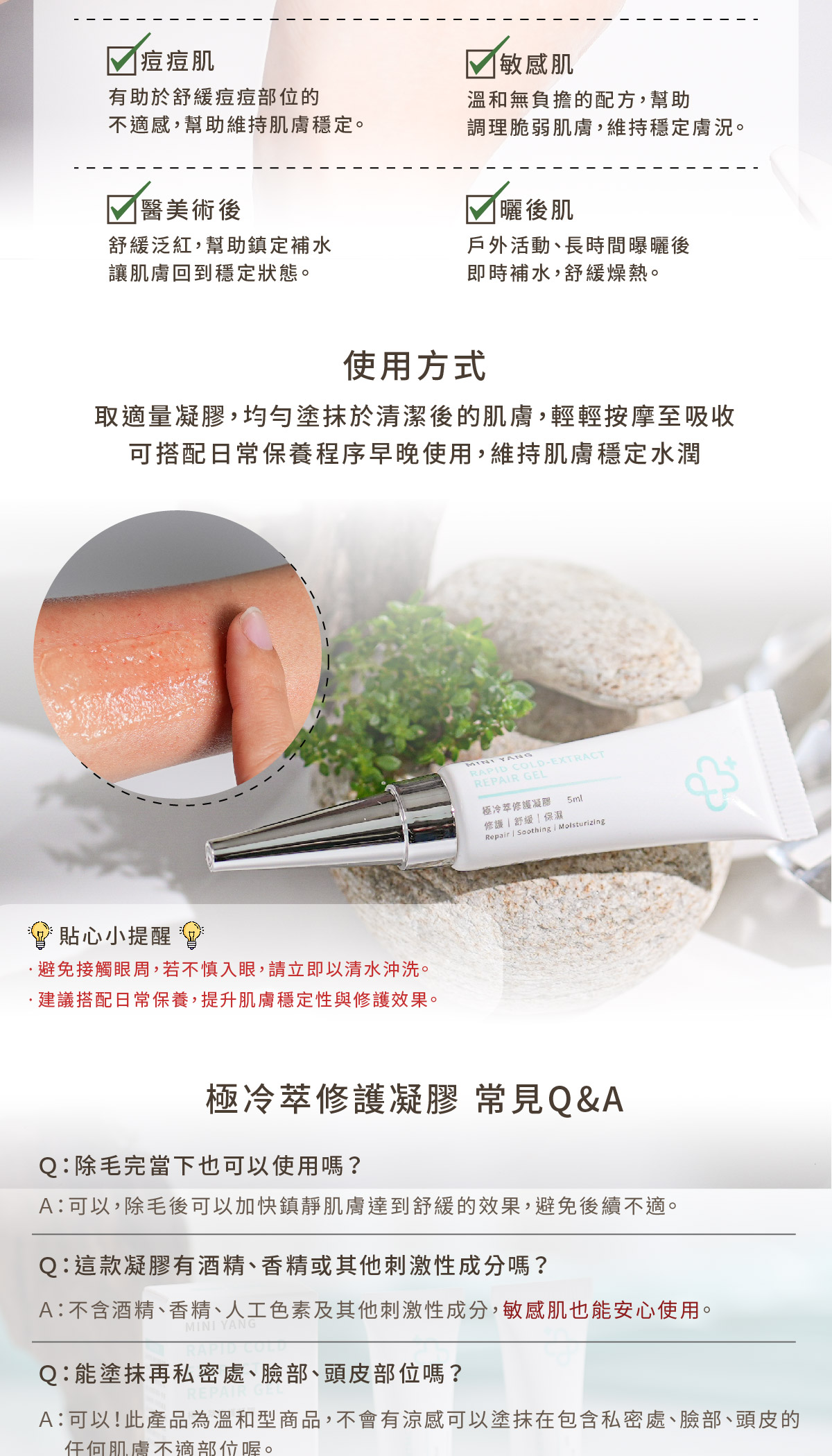 使用方式:可搭配於各種除毛方式後使用(熱蠟除毛、剃毛、除毛膏、雷射除毛、冰肌除毛)