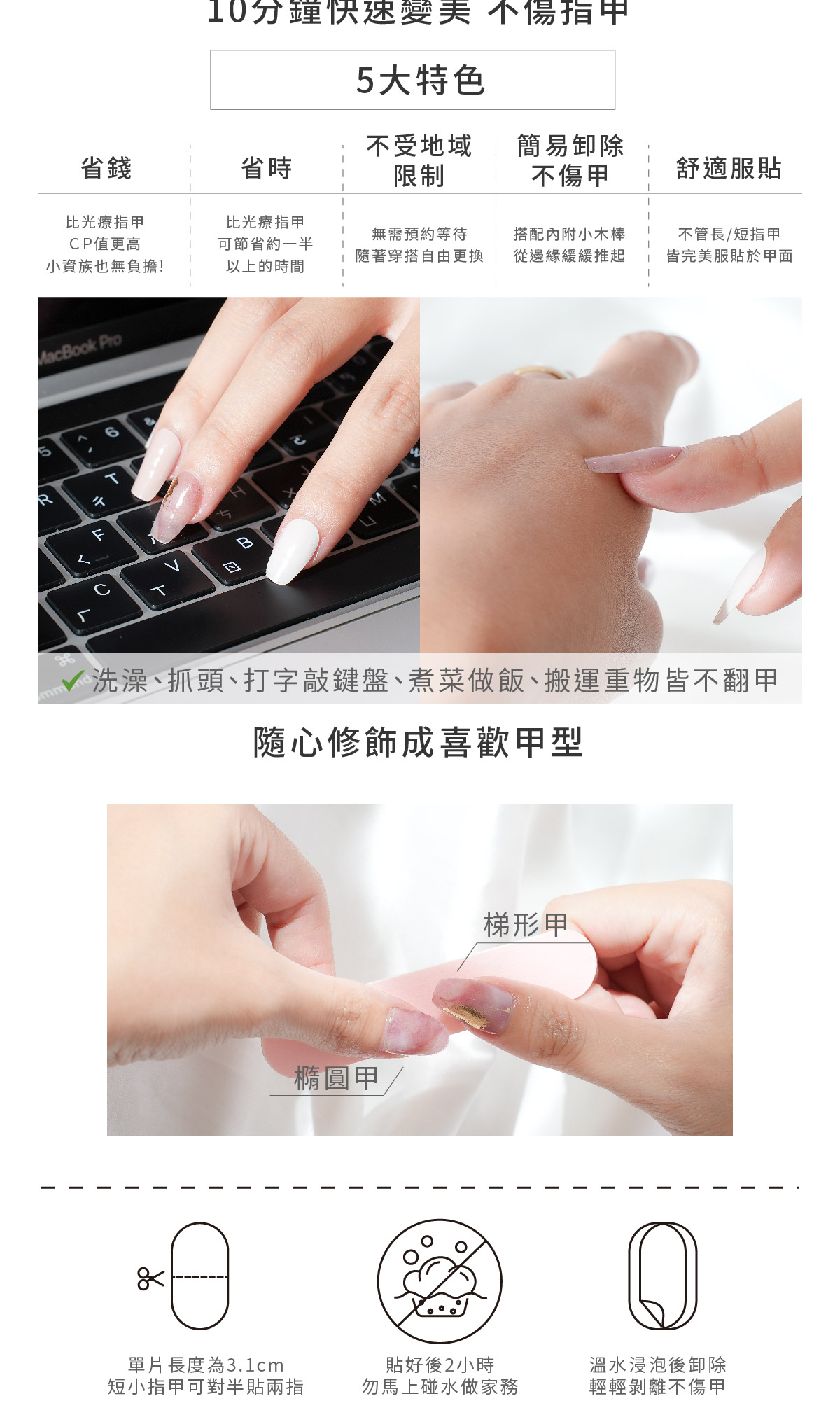 1.省錢 2.省時 3.不受地域限制 4.簡易卸除不傷甲 5.舒適服貼